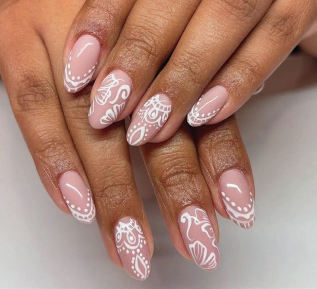 Intricate nail art completes this elegant lace-inspired look by New York-based nailist, Gladys Garcia of @glambygladys_.