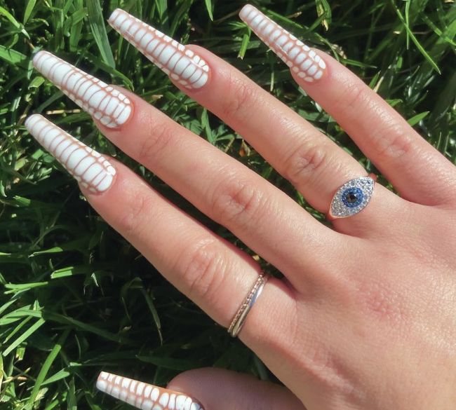 Jasmine of @jbepolished, California, channels croc print couture for this long, nude and white statement style.