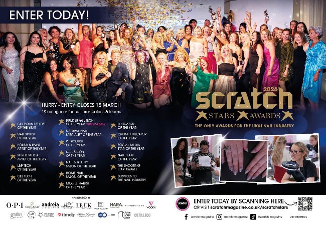 Time is running out to enter the UK and Ireland’s only nail industry awards, which has 19 categories open for entry until 15 March 23:59 GMT. These include Mixed Media Artist of the Year, Nail Salon of the Year, Educator of the Year and new category, Builder Gel Tech of the Year. Professionals can enter up to two categories via online forms, as well as submit nominations for nail pros, salons, educators or teams. Discover entry tips from page 22, and submit your entry via www.scratchmagazine.co.uk/scratchstars