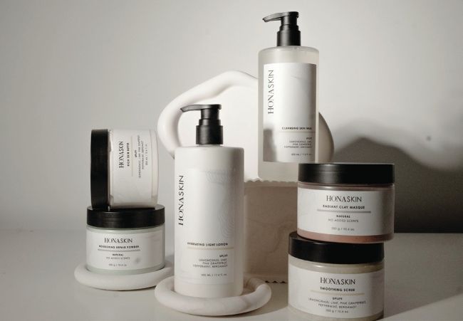 HONA SKIN debuts with 10 professional-grade products, with many available in four scent variations: Bare (fragrance free), Uplift, Focus and Relax. The range also features a selection of professional tools to ensure ease of application.
