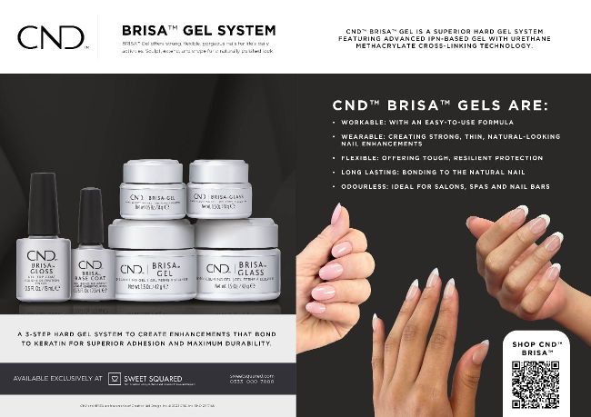 £59.95 + VAT www.sweetsquared.com “CND Brisa™ Glass is a clear sculpting gel, perfect for embellishment encasement and negative space nail art,” explains Sarah Marr, CNDTM lead education ambassador for the UK. “Its crystal clear finish allows technicians to preserve design depth, while maintaining a clean, professional look.”