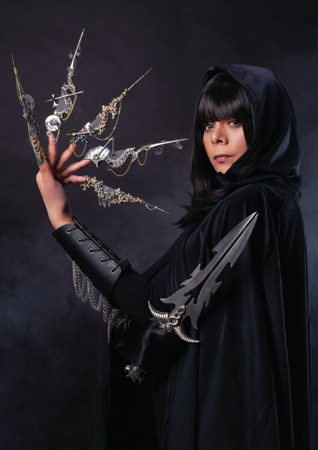 “The Warrior look took 45-50 hours to complete over two weeks. I created a rustic, armour-inspired finish using layered paints, gels, chrome, mesh and 3D elements. The weapon motifs and embellishments were hand-made, adding depth, texture and character.