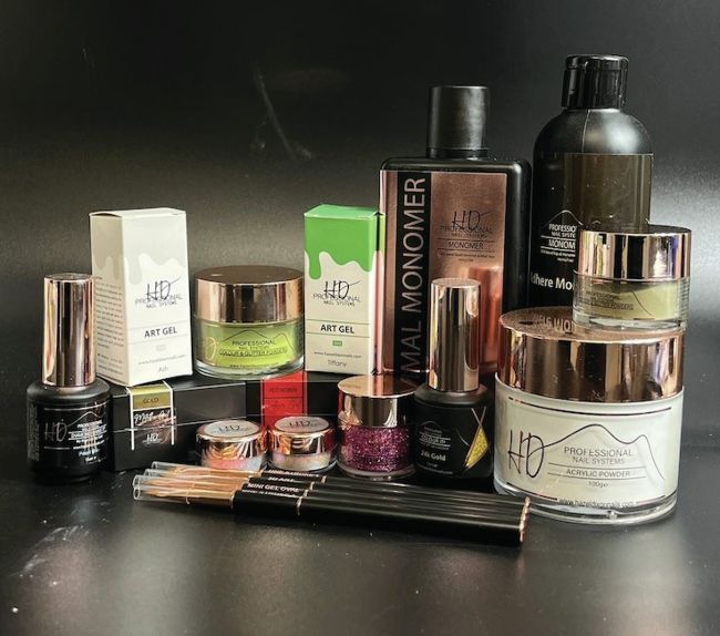 Hazel’s mixed media kit includes the following products from her brand, HD Professional Nail Systems: Monomers, Core Powders, Colour Acrylic Powders, Colour It! Gel Polishes, Art Gels, Design It! Colour Gels, Loose Glitters and Art Brushes.
