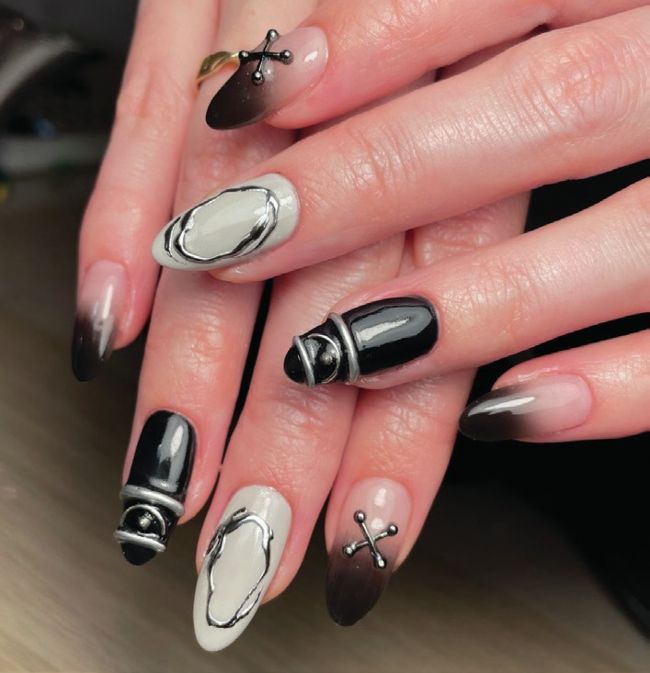 Laura Chree, an Artistic Nail Design educator at Sweet Squared, used Artistic Putty to add texture to this edgy design.