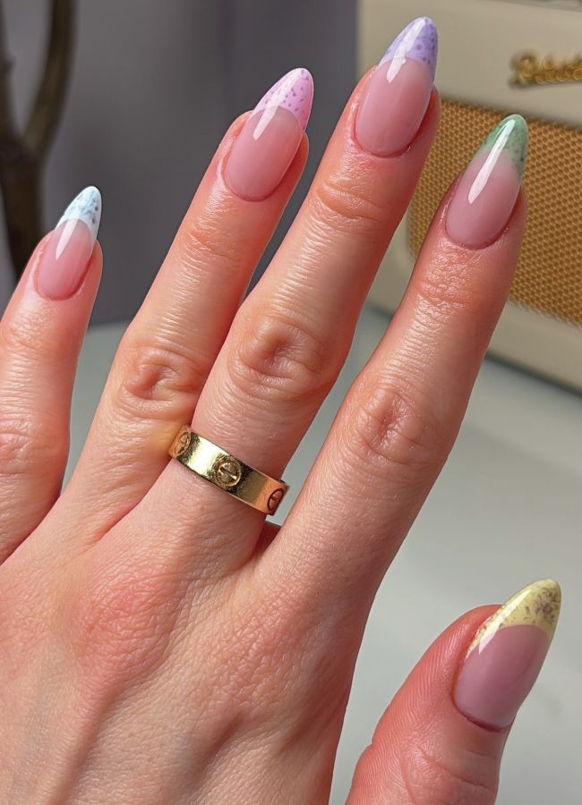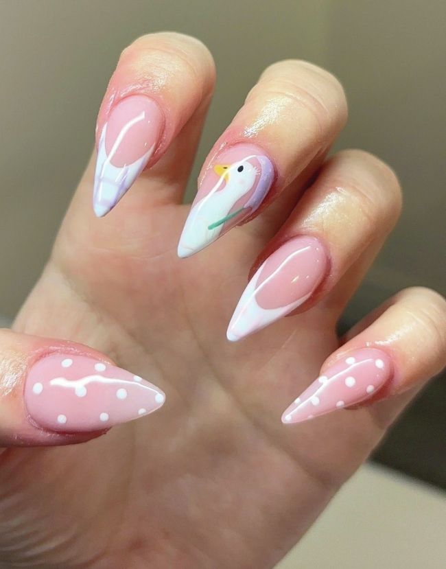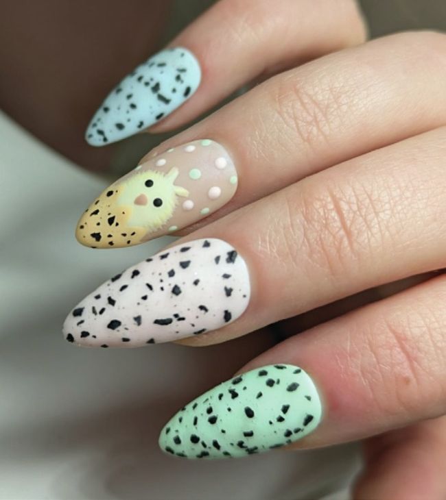 Hara Professional brand ambassador, she champions its gel polish and builder gel products – and used them to fashion this speckled nail style featuring a cute spring chick.